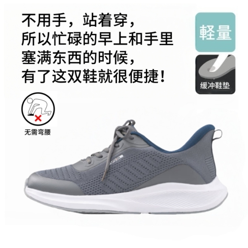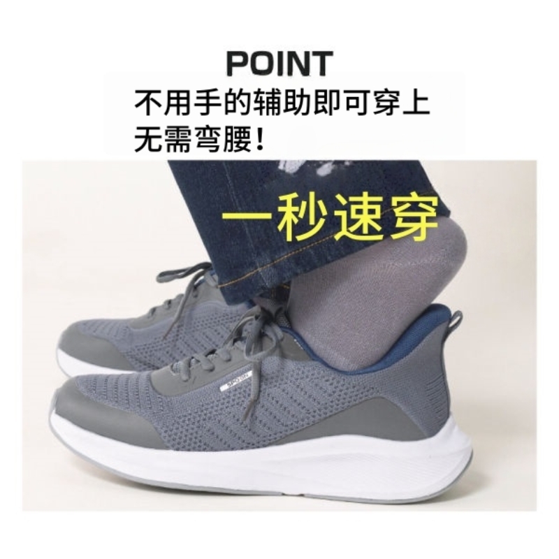 Hands-free shoes that can be put on while standing, without using hands or bending over. They are suitable for the elderly, pregnant women and people with physical inconveniences.