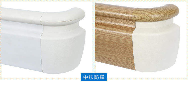 抗菌防撞扶手由抗菌PVC面板、優(yōu)質(zhì)鋁合金內(nèi)襯、彎頭、支撐架等組成;設(shè)計符合人體力學(xué)的要求,手握時有舒適感;表面PVC面板采用高分子抗菌材料,有防滑紋路,可抗菌、防污、不易變色,便于清潔,具有抗菌性、阻燃性、耐寒性等特性,產(chǎn)品經(jīng)國家權(quán)威機構(gòu)檢驗合格;整體色澤均勻,無明顯色差;扶手內(nèi)襯鋁型材,采用優(yōu)質(zhì)的鋁錠擠出成型,有堅固和防撞效果;扶手在每個轉(zhuǎn)角處有陰陽角連接配合,可使扶手的美觀無縫連接及保護墻面。
