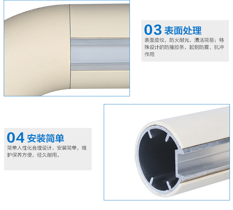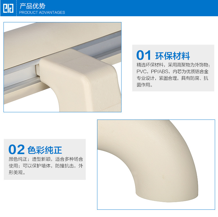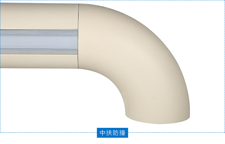 抗菌防撞扶手由抗菌PVC面板、優(yōu)質(zhì)鋁合金內(nèi)襯、彎頭、支撐架等組成;設計符合人體力學的要求,手握時有舒適感;表面PVC面板采用高分子抗菌材料,有防滑紋路,可抗菌、防污、不易變色,便于清潔,具有抗菌性、阻燃性、耐寒性等特性,產(chǎn)品經(jīng)國家權威機構檢驗合格;整體色澤均勻,無明顯色差;扶手內(nèi)襯鋁型材,采用優(yōu)質(zhì)的鋁錠擠出成型,有堅固和防撞效果;扶手在每個轉角處有陰陽角連接配合,可使扶手的美觀無縫連接及保護墻面。