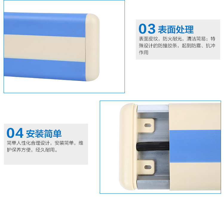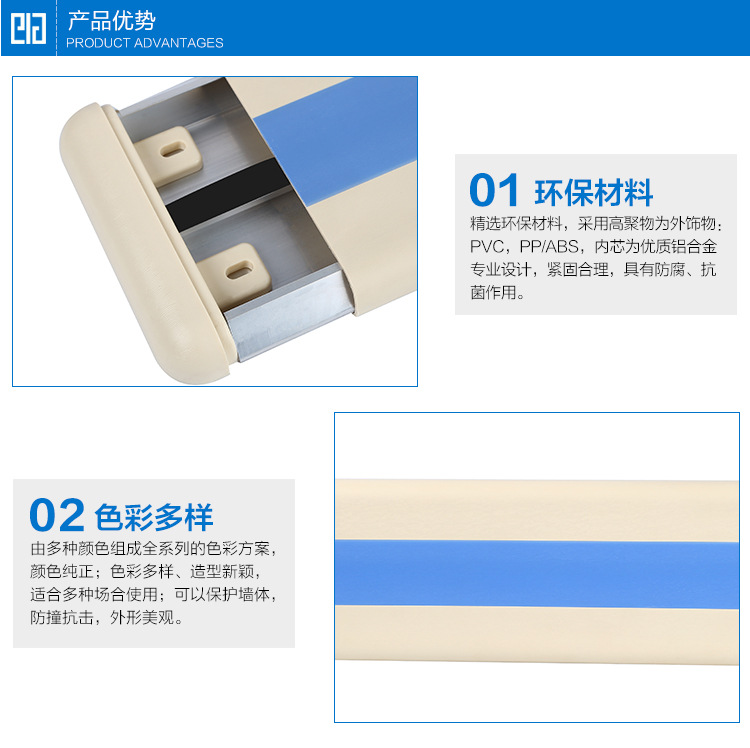 抗菌防撞護(hù)板采用高聚物PVC為外飾物,此PVC有防火、防腐、抗菌、易清潔等效果;安裝簡單,津貼墻面,維護(hù)保養(yǎng)方便,經(jīng)久耐用;3、款式多樣,寬窄均可,色彩豐富;護(hù)板內(nèi)芯為優(yōu)質(zhì)鋁合金專業(yè)設(shè)計(jì),緊固合理;表面批文,防火耐光,清潔簡易;抗菌防撞護(hù)板和抗菌防撞扶手一起使用,整體保護(hù)墻面,防撞、抗擊、抗沖。