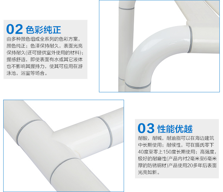 采用4mm厚度的高品質(zhì)德國尼龍材料,內(nèi)襯采用304不銹鋼管或優(yōu)質(zhì)鋁合金組成;有抗菌、防火、耐磨、耐酸、耐堿、耐油脂及防滑等性能;表面有防滑浮點,產(chǎn)品是能達(dá)到食品級的環(huán)保材料;有抗沖擊型,產(chǎn)品表面撞擊后不會像金屬管材產(chǎn)生凹痕,不會有任何傷痕;有耐溫性,可以在攝氏零下四十度到零上五十度中長期使用,可為客戶提供配色服務(wù),色彩多樣,整潔美觀,使墻面充滿活力,保養(yǎng)方便、持久耐用。