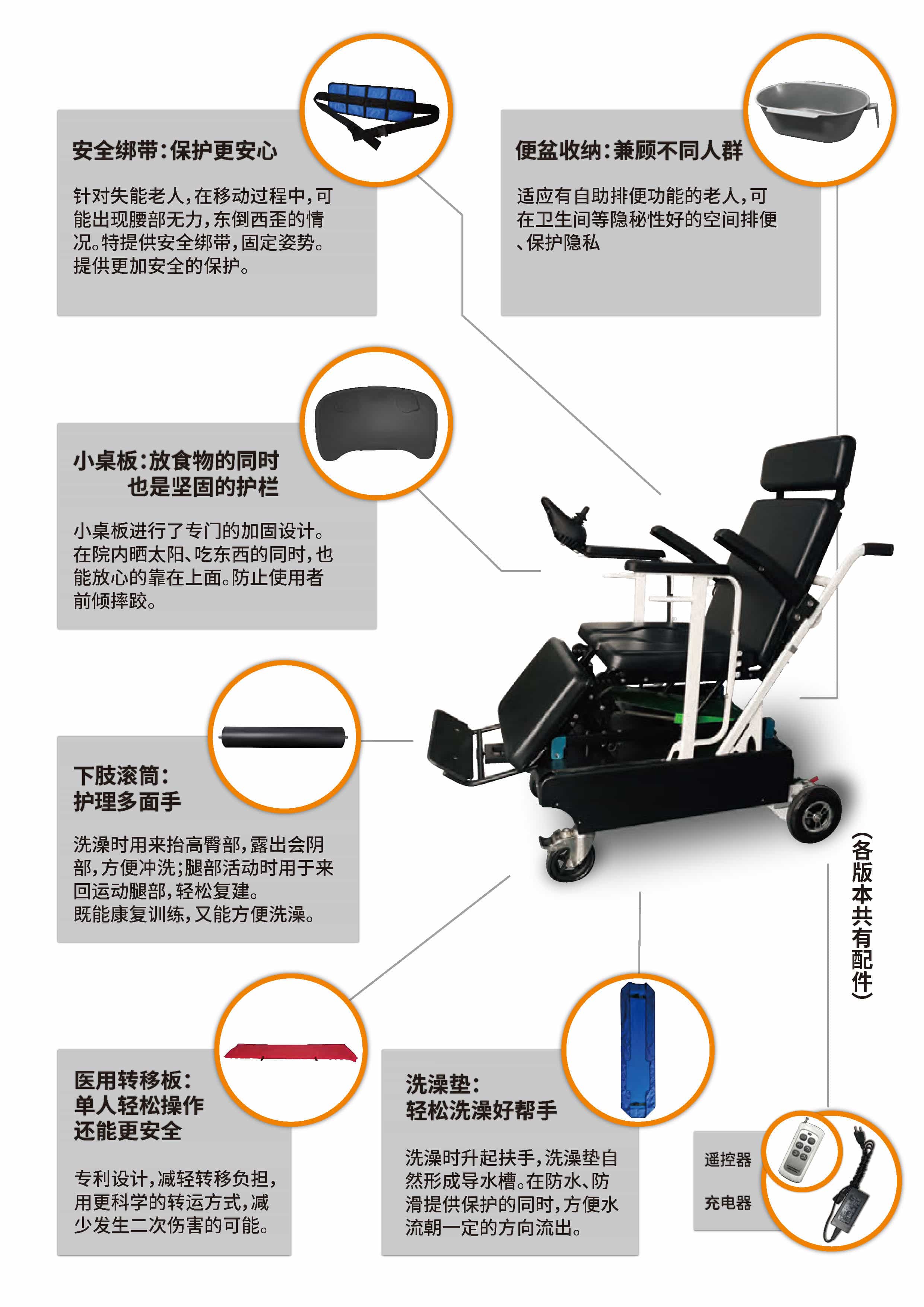產(chǎn)品特點(diǎn): 1)解決截癱患者床、椅相互轉(zhuǎn)移痛點(diǎn),實(shí)現(xiàn)截癱患者轉(zhuǎn)移生活無(wú)障礙活動(dòng)閉環(huán); 2)解決截癱患者自己處理二便、進(jìn)浴室洗浴的基本生活問(wèn)題; 3)提高截癱患者自理能力; 4)提高截癱患者就業(yè)率; 5)提高截癱患者個(gè)人尊嚴(yán)、個(gè)人隱私。 應(yīng)用場(chǎng)景: 1.截癱患者在床上通過(guò)遙控對(duì)主機(jī)變形,使得主機(jī)與床等高并靠攏床邊、降下前扶手和靠背; 3、一部分截癱患者可以通過(guò)自身努力翻滾或上肢撐移的方式,實(shí)現(xiàn)由床轉(zhuǎn)