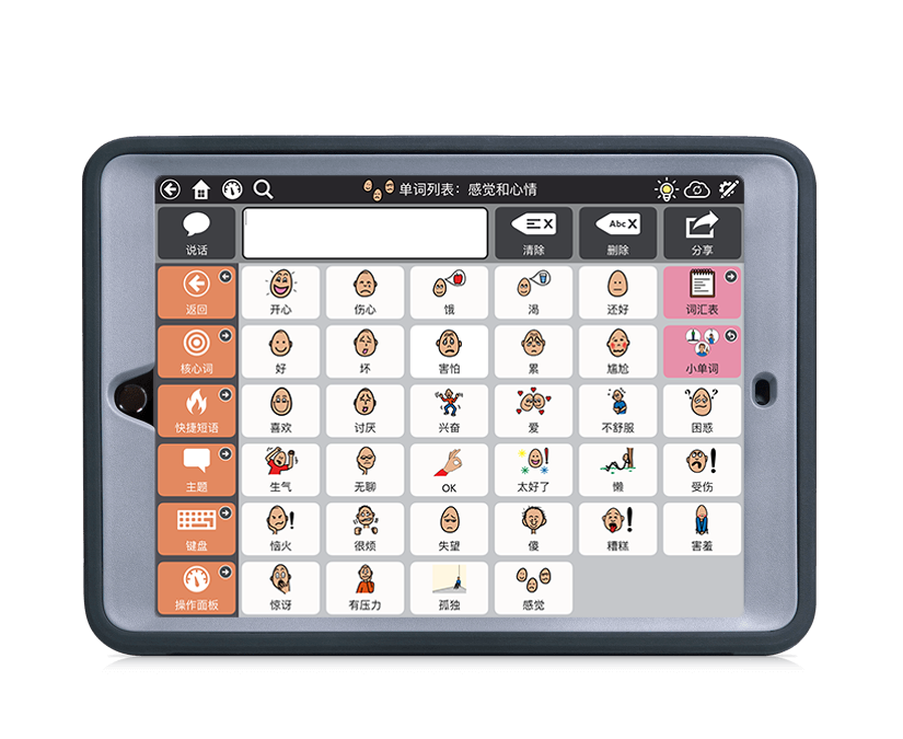 SC溝通平板是一款A(yù)AC輔助溝通設(shè)備,專為有溝通障礙的人群使用,如自閉癥、腦癱、腦卒中、腦外傷等。 ? 配有手柄和支架,方便用戶攜帶。經(jīng)過安全測試可承受撞擊和跌落,同時配有防撞角和屏幕保護框架。核心軟件為AAC溝通軟件 TD Snap,通過TD Snap 架起溝通的橋梁,自由表達。