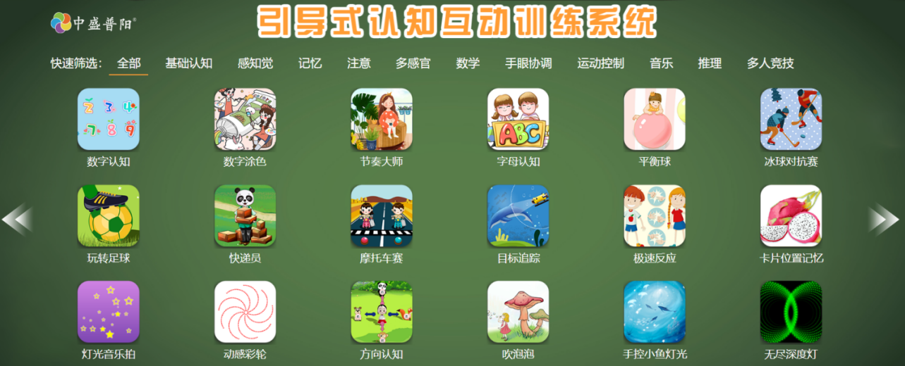 核心功能: 系統(tǒng)將智能多媒體技術(shù)與康復(fù)訓練相結(jié)合,循序漸進地指引用戶融入訓練,以游戲的方式呈現(xiàn)訓練內(nèi)容,減少用戶對康復(fù)訓練過程中的排斥心理,最大限度地調(diào)動用戶主動參與、主動學習的能力,提高訓練積極性。如:冰球?qū)官?,可以單機也可以雙人互動,共同推動冰球到對方球門,直至一方勝利。系統(tǒng)內(nèi)置內(nèi)容豐富,是一款為用戶提供腦功能認知訓練和多感覺運動訓練的專業(yè)設(shè)備,讓用戶在豐富的游戲中提升能力達到訓練目標。