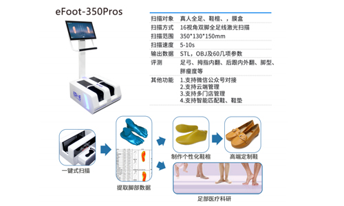 腳型3D掃描儀(雙腳)可對人體腳型,鞋楦楦型進行三維掃描,采集高精度腳型和楦型3D數(shù)據(jù),并生成60幾組個性化測量參數(shù),支持上傳與下載,廣泛用于制鞋產(chǎn)業(yè)與醫(yī)療康復(fù)領(lǐng)域.