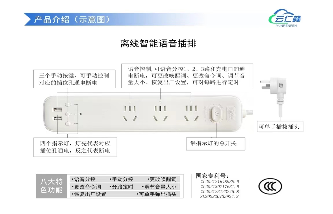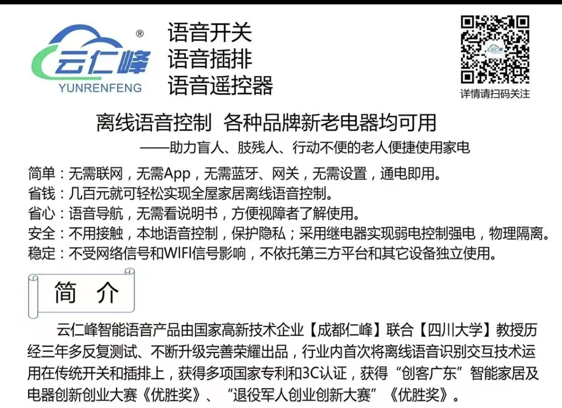 離線語音控制 各種品牌新老電器均可用 ——助力盲人、肢殘人、行動(dòng)不便的老人便捷使用家電 簡(jiǎn)單:無需聯(lián)網(wǎng),無需App,無需藍(lán)牙、網(wǎng)關(guān),無需設(shè)置,通電即用。 省錢:幾百元就可輕松實(shí)現(xiàn)全屋家居離線語音控制。 省心:語音導(dǎo)航,無需看說明書。 安全:不用接觸,本地語音控制,保護(hù)隱私;采用繼電器實(shí)現(xiàn)弱電控制強(qiáng)電,物理隔離。 穩(wěn)定:不受網(wǎng)絡(luò)信號(hào)和WlFl信號(hào)影響,不依托第三方平臺(tái)和其它輔助設(shè)備獨(dú)立使用。