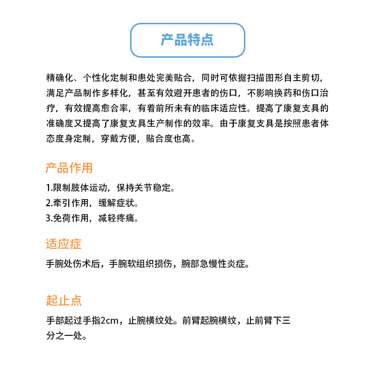 產(chǎn)品特點(diǎn) 精確化、個(gè)性化定制和患處完美貼合,同時(shí)可依據(jù)掃描圖形自主剪切,滿足產(chǎn)品制作多樣化,甚至有效避開患者的傷口,不影響換藥和傷口治療,有效提高愈合率,有著前所未有的臨床適應(yīng)性。提高了康復(fù)支具的準(zhǔn)確度又提高了康復(fù)支具生產(chǎn)制作的效率。由于康復(fù)支具是按照患者體態(tài)度身定制,穿戴方便,貼合度也高。 產(chǎn)品作用 1.限制肢體運(yùn)動(dòng),保持關(guān)節(jié)穩(wěn)定。 2.牽引作用,緩解癥狀。 3.免荷作用,減輕疼痛。