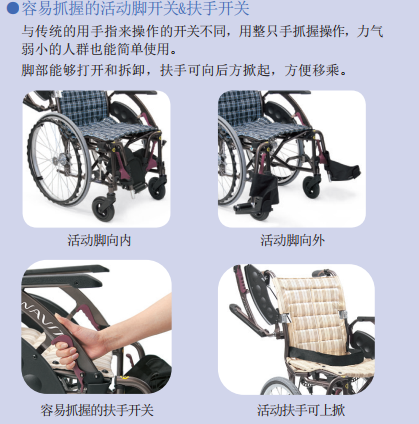 乘坐舒適的曲線車架輪椅,三條曲線車架貼合身體曲線,乘坐舒適,長時間乘坐也不易疲勞?;顒臃鍪趾突顒幽_,方便移乘。