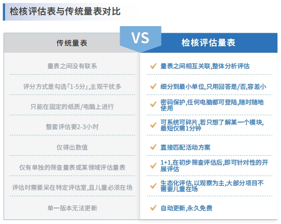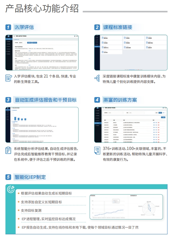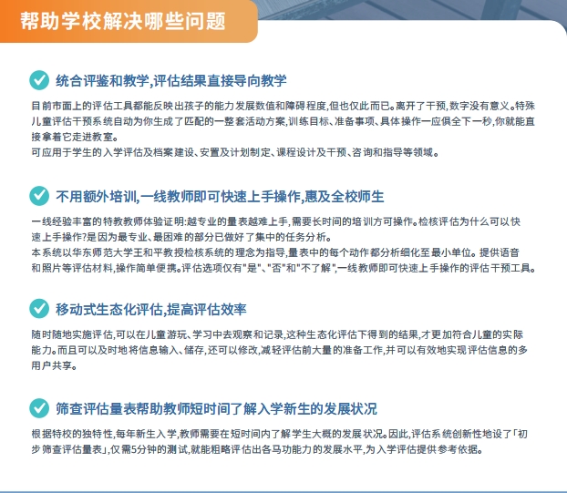 特殊兒童評(píng)估干預(yù)系統(tǒng)是一套以檢核評(píng)估理念為依據(jù)的非標(biāo)準(zhǔn)化評(píng)估工具,從特殊兒童能力角度出發(fā),適用于各類特殊兒童,包含感知、認(rèn)知、運(yùn)動(dòng)、社會(huì)適應(yīng)、生活自理、社交技巧、語(yǔ)言與溝通七大領(lǐng)域評(píng)估,同時(shí)系統(tǒng)內(nèi)嵌入的活動(dòng)方案為新晉特教教師提供了個(gè)訓(xùn)實(shí)操參考,是一款簡(jiǎn)單實(shí)用并兼具專業(yè)性的評(píng)估工具。
