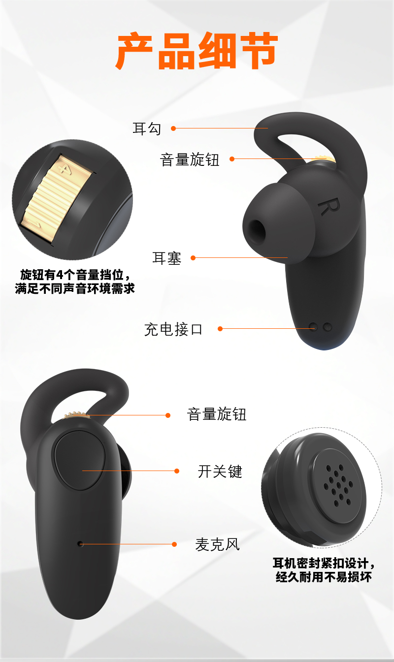 智能降噪,應(yīng)急充電,手電筒照明,音質(zhì)清晰,久戴不痛,不易掉落,持久續(xù)航,方便攜帶,可調(diào)音量,多場景使用
