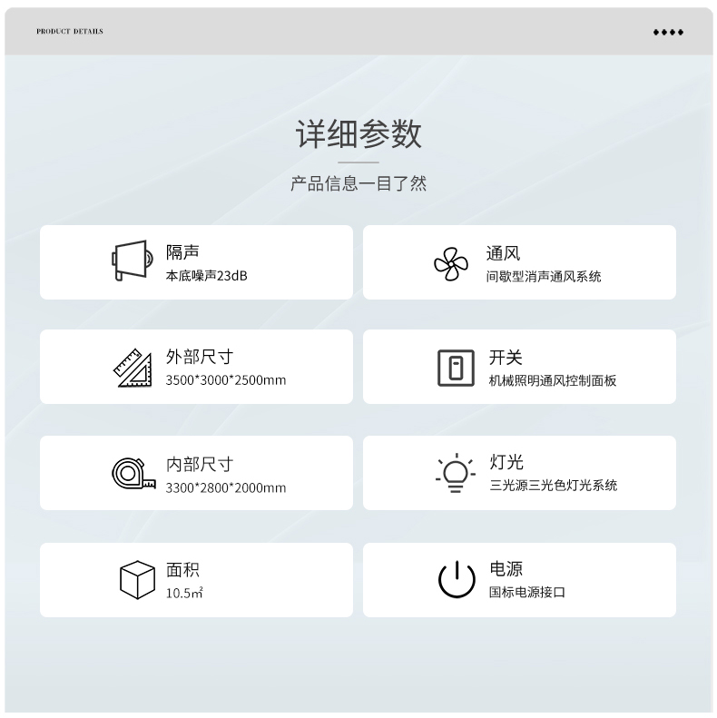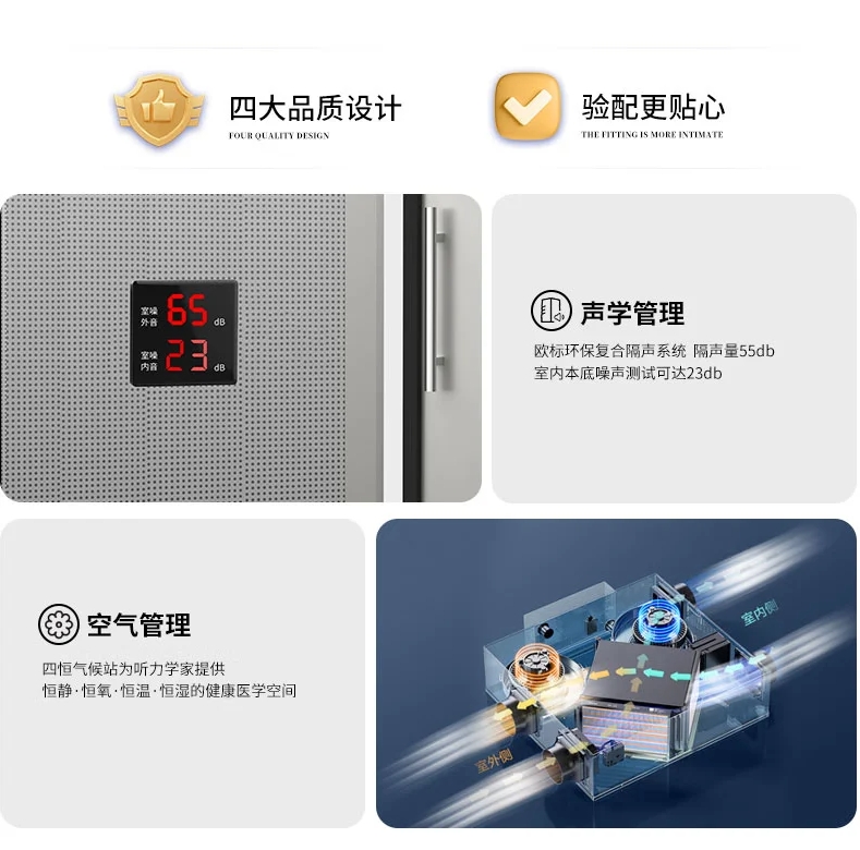 型號(hào):L350 隔聲:室外環(huán)境噪聲≤55dB (A),室內(nèi)本底噪聲≤23dB (A) 環(huán)保:甲醛釋放量≤0.4mg/L,滿足《室內(nèi)裝飾裝修材料及人造板棉制品中甲醛釋放量》 參考標(biāo)準(zhǔn): JJF 1191-2019《測(cè)聽(tīng)室聲學(xué)特性校準(zhǔn)規(guī)范》 GB 3096-2022《聲環(huán)境質(zhì)量標(biāo)準(zhǔn)》 GB 50325-2020《民用建筑工程室內(nèi)環(huán)境污染控制標(biāo)準(zhǔn)》 適用范圍:純音測(cè)聽(tīng)、言語(yǔ)測(cè)聽(tīng)、兒童聽(tīng)覺(jué)言語(yǔ)檢測(cè)評(píng)估
