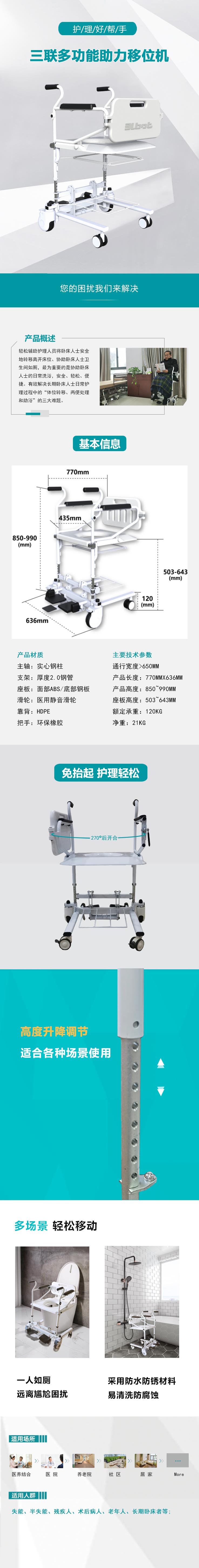 三聯(lián)多功能助力移位機,輕松的解決了照護(hù)老人、殘疾人過程中移位、如廁、助浴的三大難題。產(chǎn)品獨創(chuàng)270°后開合設(shè)計,免抬起護(hù)理更輕松;高度可升降,適合多種場景;整體采用防水防銹材料,易清洗。
