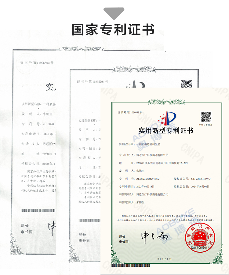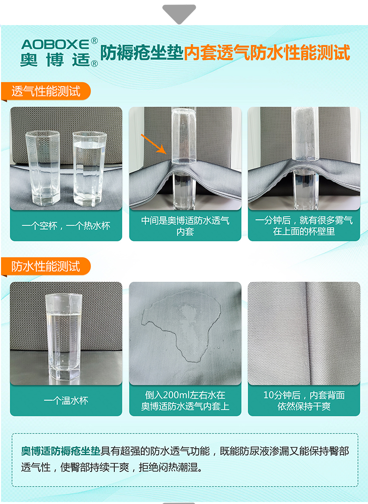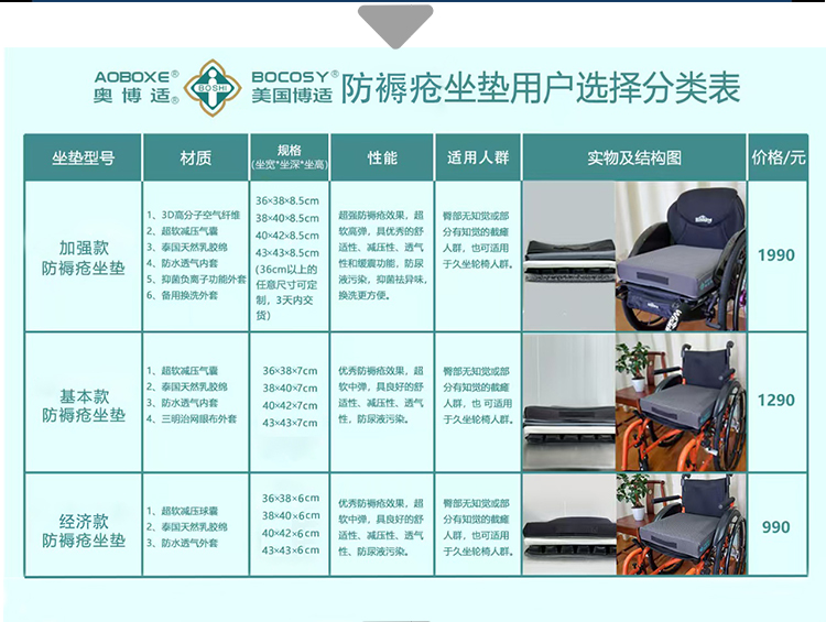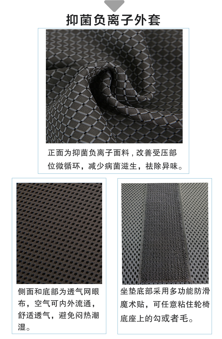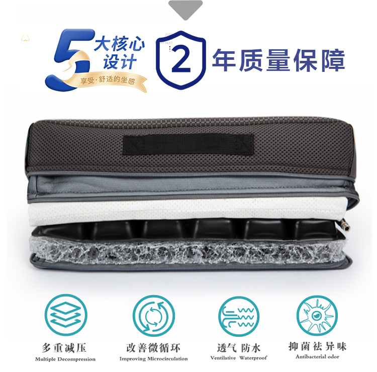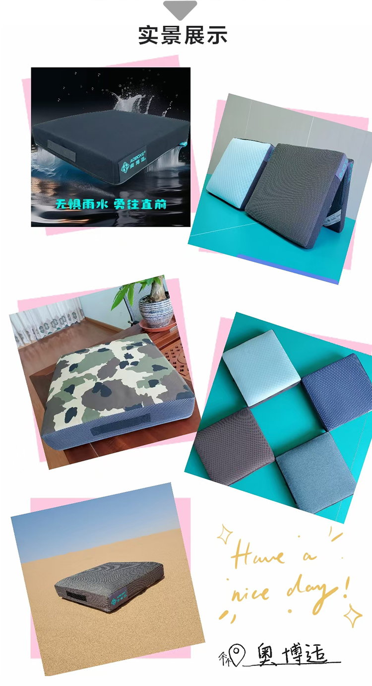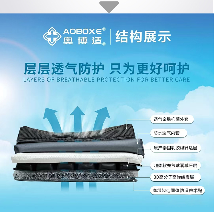品牌:奧博適 1、材質(zhì) 1、3D高分子空氣纖維 2、減壓氣囊 3、天然乳膠綿 4、防水透氣內(nèi)套 5、抑菌負(fù)離子功能外套 6、備用換洗外套 2、規(guī)格 36×38×8.5cm、38×40×8.5cm、40×42×8.5cm、43×43×8.5cm (36cm以上的任意尺寸可定制,3天內(nèi)交貨) 3、性能 防褥瘡效果最佳,超軟高彈,具優(yōu)秀的舒適性、減壓性、透氣性和緩震功能,防尿液污染,保持臀部持續(xù)
