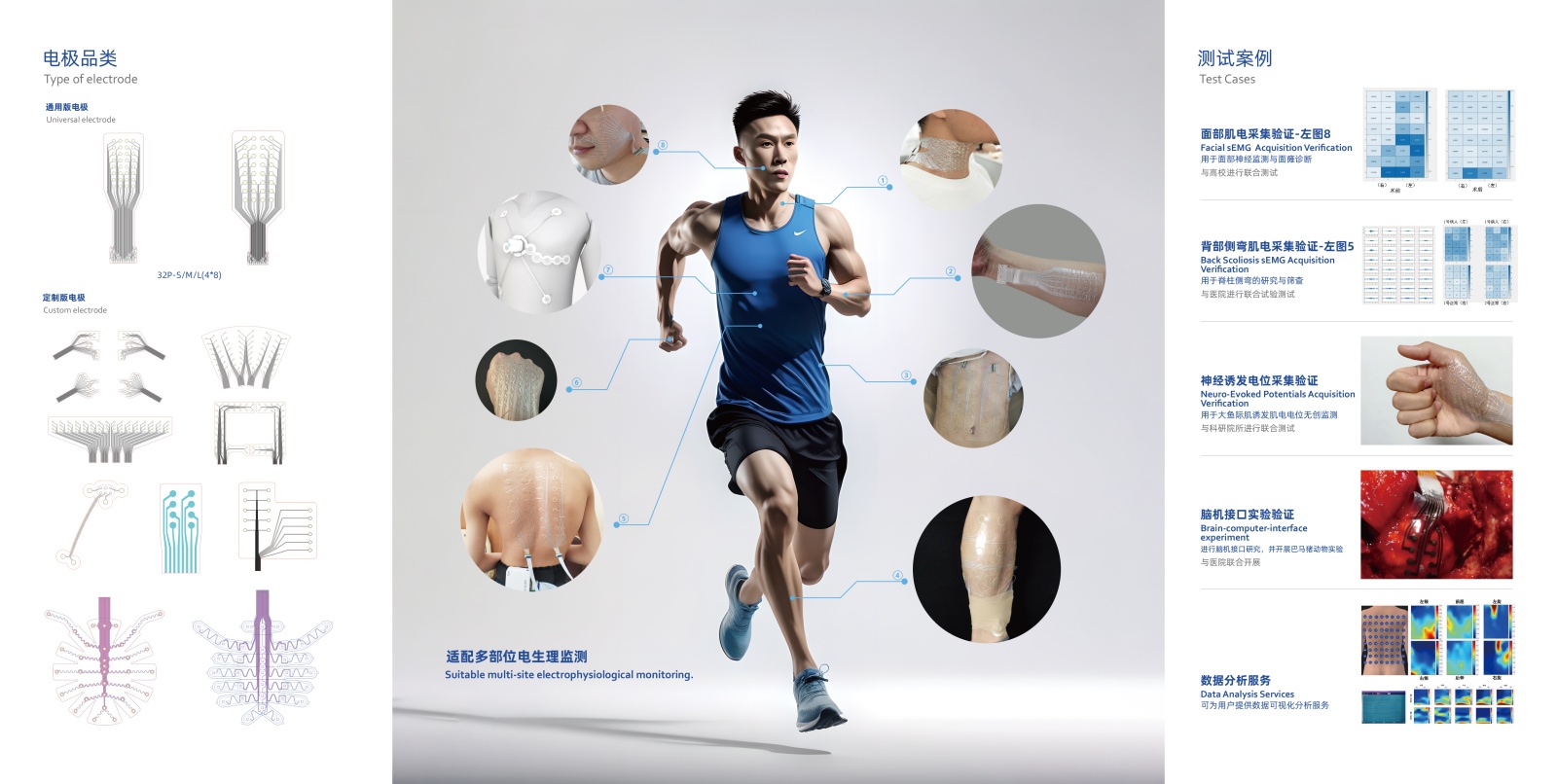 采用自主研發(fā)的醫(yī)用生物導(dǎo)電薄膜,研制新一代高密度柔性可拉伸肌電電極陣列。該電極具備高密度信號(hào)采集;形成2D圖像,反映空間信息;可大面積制備,適配人體更多區(qū)域;具有穩(wěn)定采集拉伸性,適配皮膚形變,有效降低運(yùn)動(dòng)偽影。相關(guān)產(chǎn)品滿(mǎn)足YY/T 0196-2005醫(yī)藥行業(yè)標(biāo)準(zhǔn)。