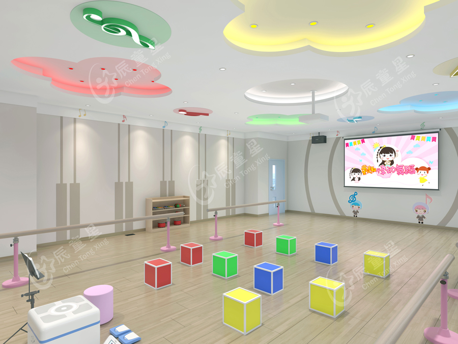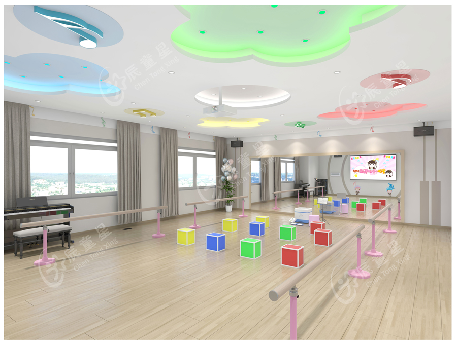 音樂(lè)律動(dòng)室是聽(tīng)障、盲障、智力障礙學(xué)生進(jìn)行舞蹈、體操、游戲、音樂(lè)教學(xué)及其它藝術(shù)活動(dòng)的場(chǎng)所,其環(huán)境設(shè)計(jì)有利于特殊學(xué)生通過(guò)視覺(jué)和殘余聽(tīng)力模仿動(dòng)作、感受舞蹈的音樂(lè)節(jié)奏。律動(dòng)教室通過(guò)訓(xùn)練學(xué)生的視、聽(tīng)、觸等綜合能力,使其注意力、記憶力、感知力、結(jié)構(gòu)化能力得到加強(qiáng)。