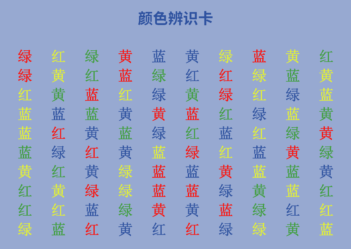 顏色辨識卡是一張訓練卡,上面有50個分別以紅、藍、黃、綠,四種顏色呈現的字。文字上的色彩與文字本身的意思并不一定相同。例如“紅色”,印刷成藍色的“紅色”。這款腦力游戲可以活化大腦,增強社交團體動力和訓練老年人認知能力。它適合應用于社區(qū)及養(yǎng)老機構,可以兩兩一組開展活動,分為一組和二組,每人發(fā)一份測驗記錄表和筆,計時兩分鐘,一人讀,一人記錄,讀正確的在測驗記錄表里打√,讀錯的打×。