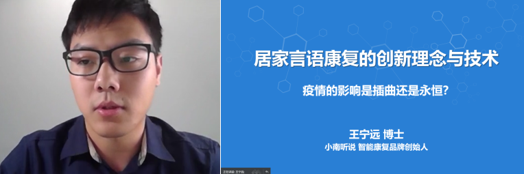 “小南聽說”智能康復(fù)品牌創(chuàng)始人、畢業(yè)于美國明尼蘇達大學(xué)認知與腦科學(xué)專業(yè)的王寧遠博士結(jié)合了近年來的技術(shù)發(fā)展,與參會人員探討了“創(chuàng)新居家言語康復(fù)的理念與技術(shù)--疫情的影響是插曲還是永恒?”這樣一個話題。在新技術(shù)的加持下,遠程康復(fù)與居家康復(fù)將會成為傳統(tǒng)線下康復(fù)模式的必要補充。