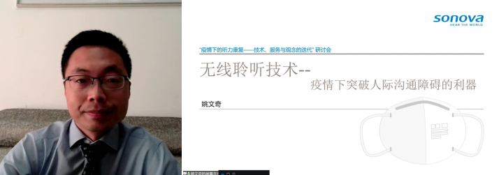 中國聾人協(xié)會信息無障礙委員會副主任、索諾瓦(Sonova)聽力全國項目技術(shù)經(jīng)理姚文奇先生為大家分享了“疫情下突破人際溝通障礙的利器——無線聆聽技術(shù)”的細節(jié)。