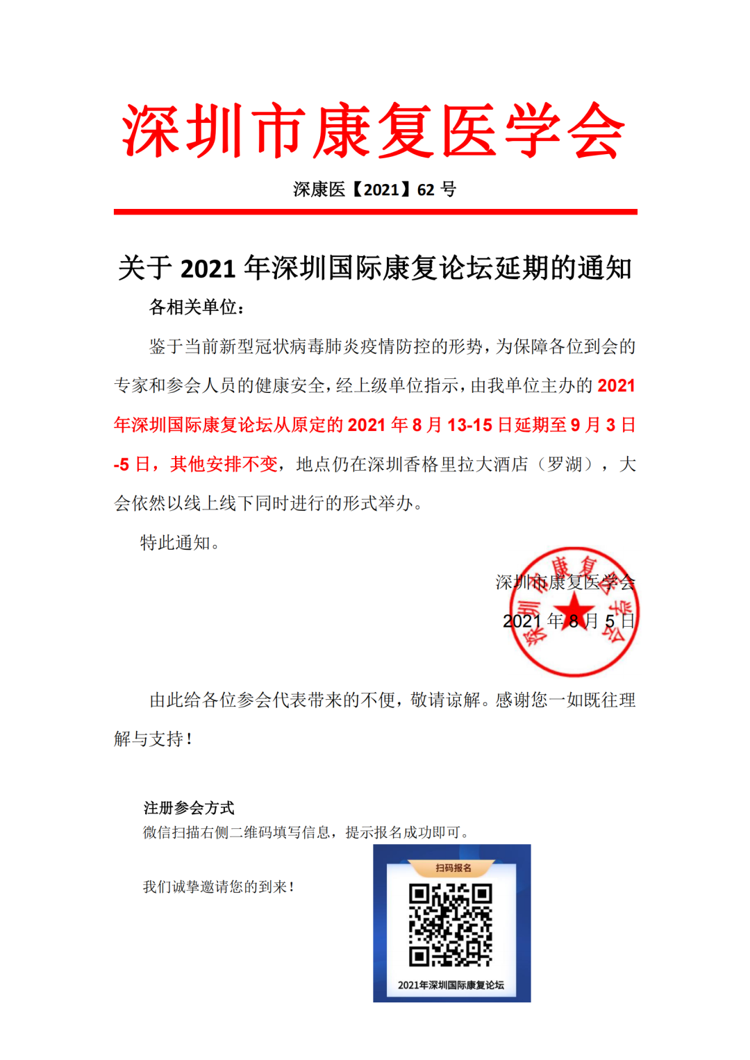 鑒于當(dāng)前新型冠狀病毒肺炎疫情防控的形勢(shì),為保障各位到會(huì)的專(zhuān)家和參會(huì)人員的健康安全,經(jīng)上級(jí)單位指示,2021年深圳國(guó)際康復(fù)論壇從原定的2021年8月13-15日延期至9月3日-5日,其他安排不變,地點(diǎn)仍在深圳香格里拉大酒店(羅湖),大會(huì)依然以線(xiàn)上線(xiàn)下同時(shí)進(jìn)行的形式舉辦。由此給各位參會(huì)代表帶來(lái)的不便,敬請(qǐng)諒解。