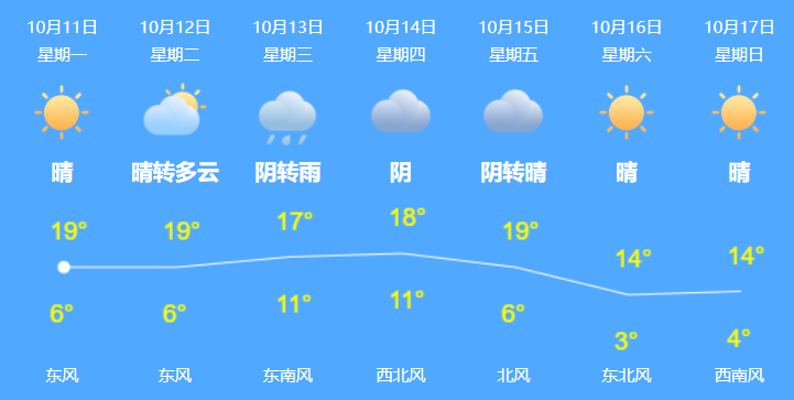 未來(lái)一周,北京天氣多變,10月13日有雨,15-17日轉(zhuǎn)晴。氣溫4~19℃,早晚溫差較大,建議備好防寒衣物。