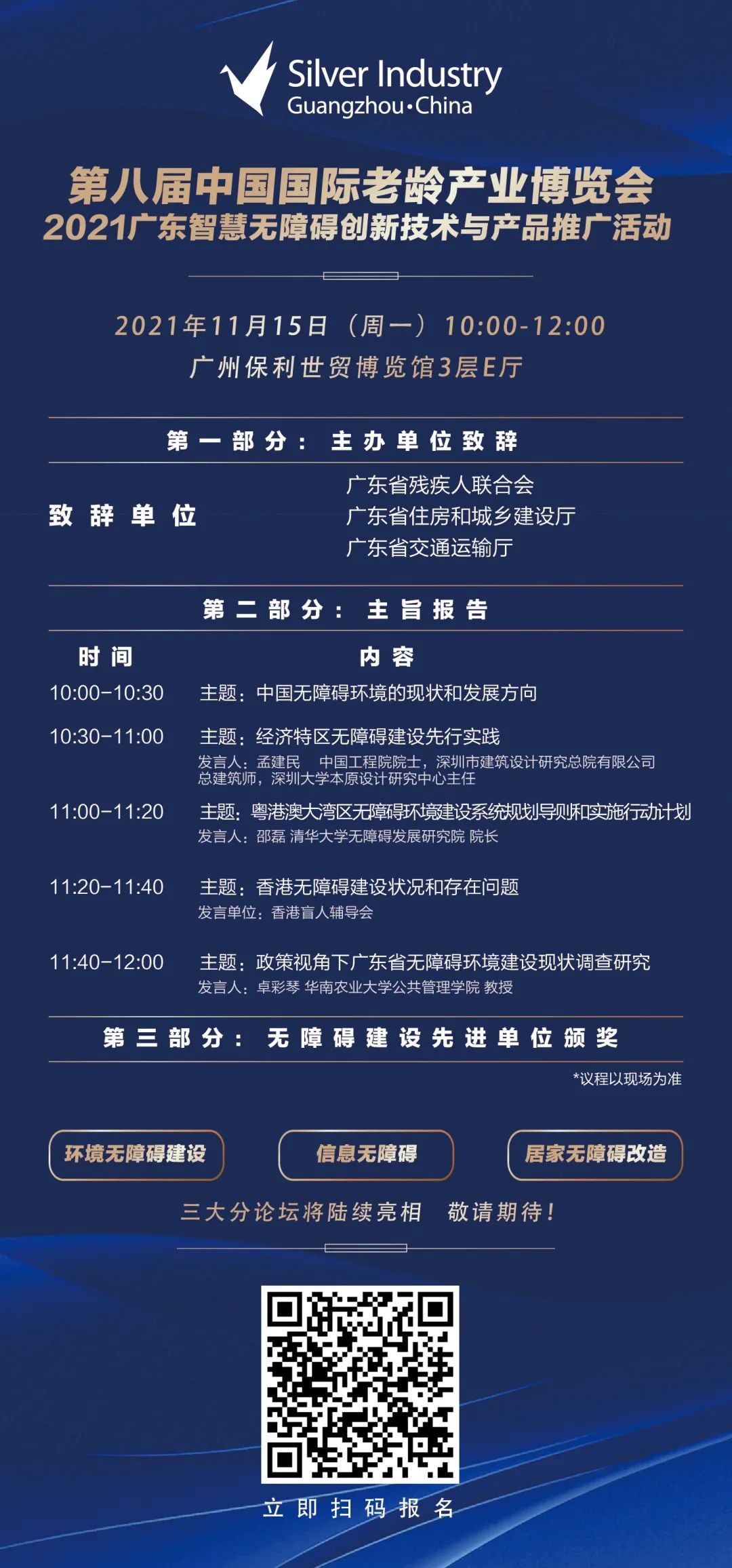 展會同期舉辦“2021 廣東智慧無障礙創(chuàng)新技術與產品推廣活動”,環(huán)境無障礙建設、信息無障礙、居家無障礙改造三大分論壇將陸續(xù)亮相,歡迎報名參會,詳情如下: