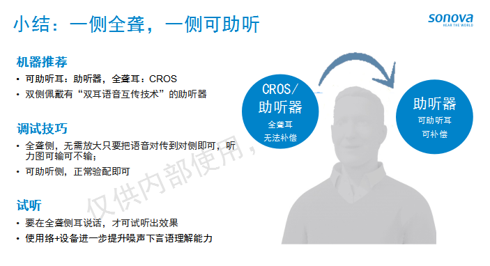 非對稱性聽力損失主要有兩種類型,一種為一側(cè)全聾,一側(cè)可助聽;另一種為雙側(cè)都可助聽但有較好耳。分享會上,孫靜分別為我們介紹了兩種類型的主要解決方案,并提出面對非對稱性聽力損失,不應(yīng)放棄雙耳驗(yàn)配,要積極發(fā)揮雙耳語音互傳技術(shù)實(shí)現(xiàn)“BICROS”功能。