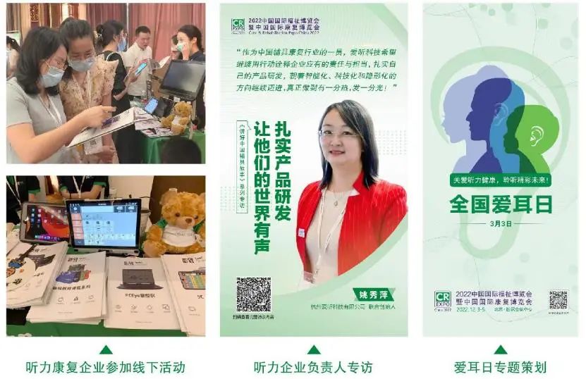 深入聽力康復(fù)行業(yè)一線,展會在全年度推出一系列相關(guān)活動,密切聯(lián)系專家學(xué)者及企業(yè)精英,為聽力企業(yè)搭建產(chǎn)、學(xué)、研、用交流平臺。此外還推出全國愛耳日專題科普,展示助聽器、人工耳蝸、聽力檢測設(shè)備等解決方案,幫助聽障群體開啟有聲世界;推出線上線下供需采購渠道,助推聽力企業(yè)加快布局市場。