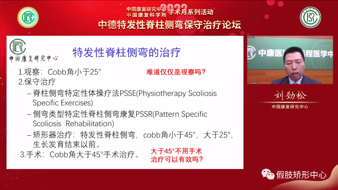 此次公益論壇就青少年特發(fā)性脊柱側(cè)彎治療的相關(guān)問題展開了討論,中國(guó)康復(fù)研究中心假肢矯形部主任劉勁松作開幕致辭。