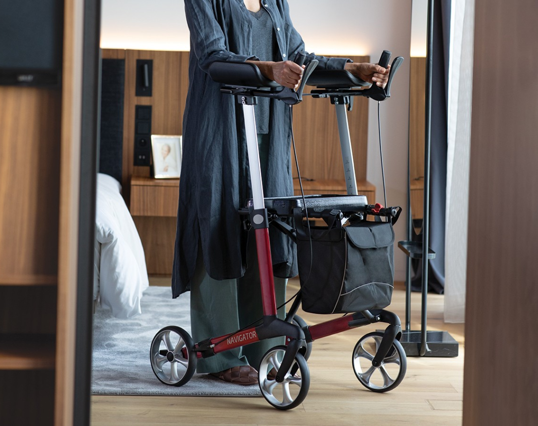 瑞云-航海家是為患有關(guān)節(jié)炎或手部功能受限的用戶開發(fā)的助行器,兼具功能性與舒適性。前臂支撐架主要由大尺寸的海綿墊和手剎組成,用戶通過手臂的力量推動助行器前行,有固定式和旋轉(zhuǎn)式兩種類型可旋轉(zhuǎn)的支撐架有三個調(diào)節(jié)角度,滿足不同用戶的需求。