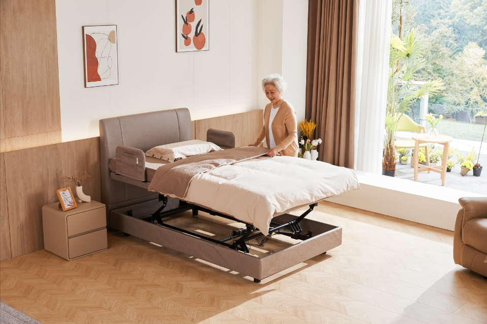 舒眠H921屬于適老化電動床,單人1.2米寬度尺寸,更加舒適。具備背部升降、腿部升降和整床升降,可滿足老人日常起居,方便上下床;以及后期處于護(hù)理階段,也方便家人照護(hù)。兩側(cè)扶手,便于抓握和儲物,后期根據(jù)老人需求,也可升級長護(hù)欄。
