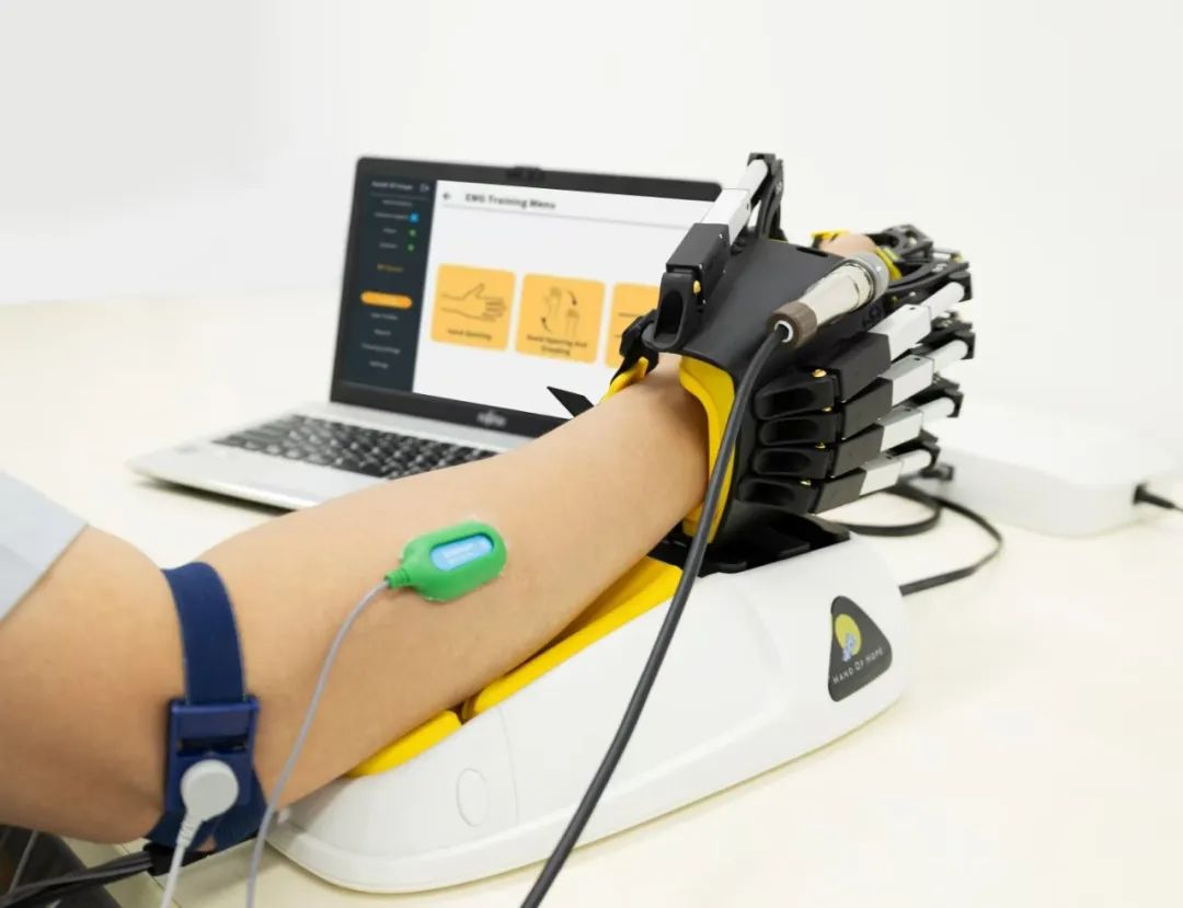 希望之手透過檢測(cè)中風(fēng)患者皮膚表面的肌電信號(hào) (EMG信號(hào)),以機(jī)械手來輔助他們進(jìn)行手部運(yùn)動(dòng)。由于肌電信號(hào)是由大腦控制運(yùn)動(dòng)的部分所發(fā)出,因此它代表了患者的運(yùn)動(dòng)意愿。肌電信號(hào)經(jīng)過實(shí)時(shí)處理及分析后會(huì)顯示于屏幕上,讓中風(fēng)患者可以了解到自己對(duì)肌肉的控制能力,提升他們?cè)趶?fù)康訓(xùn)練過程中的參與感,并有助重建神經(jīng)反應(yīng)通路,令癱瘓的手逐步恢復(fù)日常運(yùn)動(dòng)功能。