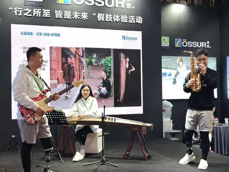 11月28日,2024中國國際福祉博覽會暨中國國際康復博覽會,三名佩戴假肢的表演者上演合奏節(jié)目。劉胤衡/攝
