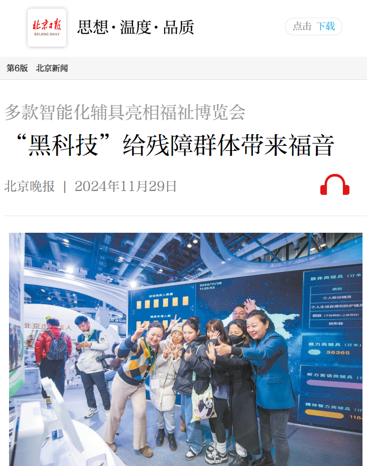 本報(bào)訊(記者任珊)11月28日,由中國殘聯(lián)主辦,中國殘疾人輔助器具中心、北京市殘聯(lián)承辦的2024年中國國際福祉博覽會(huì)開幕。今年,京津冀殘聯(lián)首次聯(lián)合集中展示三地近年來在輔具服務(wù)和無障礙環(huán)境建設(shè)方面的創(chuàng)新成果。其中,北京市殘聯(lián)攜20余類助行、助視、助聽類智能化輔助器具產(chǎn)品亮相。