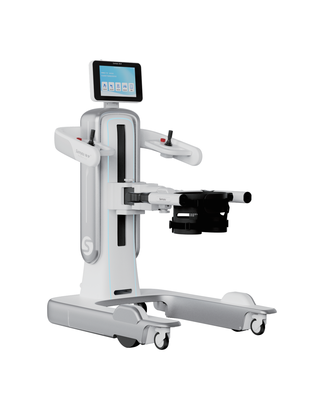 這是一款針對步行功能障礙進(jìn)行高效康復(fù)訓(xùn)練的下肢康復(fù)機器人。產(chǎn)品由計算機控制系統(tǒng)、步態(tài)矯正裝置系統(tǒng)、動靜態(tài)減重系統(tǒng)、醫(yī)用跑臺系統(tǒng)以及情景互動訓(xùn)練系統(tǒng)五大模塊組成。它可以使患者在直立體位下通過不斷重復(fù)且軌跡固定的步態(tài)訓(xùn)練,強化正常步態(tài)記憶,促進(jìn)患者本體感覺的輸入與正確運動模式的形成,從而加強大腦結(jié)構(gòu)和功能重塑,建立正確的行走模式并有效的鍛煉其相關(guān)肌肉與關(guān)節(jié),加速下肢功能的恢復(fù)。