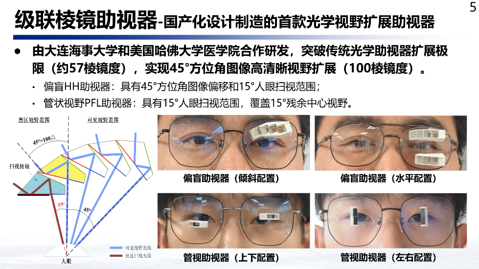 本產(chǎn)品是由大連海事大學與美國哈佛大學醫(yī)學院合作研發(fā),可以顯著改善視野缺損人群視覺感知能力。產(chǎn)品受到國家重點研發(fā)計劃國合重點專項資助,實現(xiàn)光學視野輔助產(chǎn)品的國產(chǎn)化設計、產(chǎn)業(yè)化制造和智能化適配。級聯(lián)棱鏡助視器采用雙反射光學設計和多模塊光學級聯(lián)構造,突破商用光學助視器擴展極限(約57棱鏡度),實現(xiàn)高棱鏡功率、高視覺清晰度光學視野擴展(100棱鏡度)。