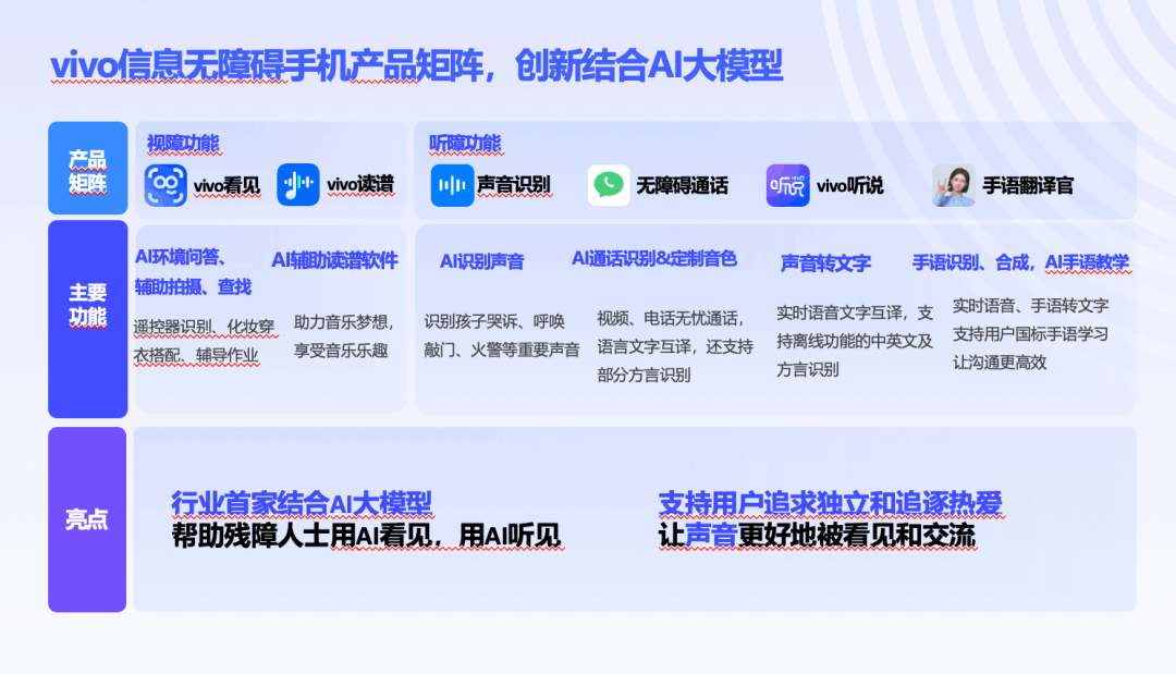 vivo 始終踐行“科技照亮美好未來(lái)”的使命,在無(wú)障礙領(lǐng)域已構(gòu)建起系統(tǒng)性解決方案。聽(tīng)覺(jué)上,“vivo 聽(tīng)說(shuō)”實(shí)時(shí)實(shí)現(xiàn)語(yǔ)音文字互轉(zhuǎn),讓聽(tīng)障朋友接打電話(huà)、面對(duì)面交流都順暢;“聲音識(shí)別” 敏銳捕捉嬰兒啼哭、汽車(chē)?yán)鹊汝P(guān)鍵音;全球首款“手語(yǔ)翻譯官”更填補(bǔ)空白,識(shí)別1300個(gè)手語(yǔ)詞匯,準(zhǔn)確率超 80%,讓無(wú)聲表達(dá)被讀懂。視覺(jué)上,“vivo 看見(jiàn)”是行業(yè)首個(gè)依托自研多模態(tài)大模型,幫視障朋友描述環(huán)境、讀保質(zhì)期、獨(dú)立逛書(shū)店陪孩子等;“vivo 讀譜”讓盲人免費(fèi)學(xué)鋼琴,不用再依賴(lài)厚重盲譜。從單一功能到生態(tài)共建,從技術(shù)創(chuàng)新到公益落地,vivo 的無(wú)障礙之路始終圍繞“有愛(ài),無(wú)礙”的初心。