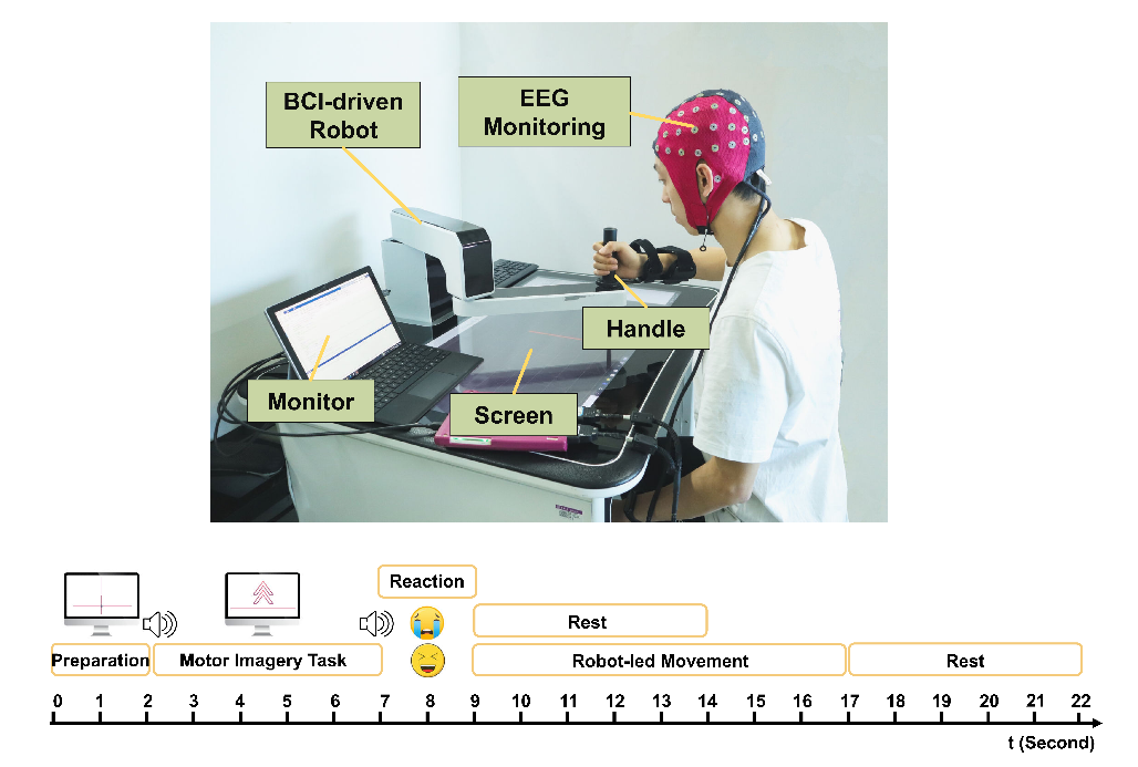 本項(xiàng)腦機(jī)交互技術(shù)實(shí)時(shí)解碼人體的運(yùn)動(dòng)意圖進(jìn)而實(shí)現(xiàn)控制外部設(shè)備執(zhí)行相應(yīng)的動(dòng)作。在康復(fù)訓(xùn)練過(guò)程中,患者可通過(guò)調(diào)動(dòng)自身的主動(dòng)運(yùn)動(dòng)意圖控制康復(fù)機(jī)器人牽動(dòng)偏癱側(cè)肢體執(zhí)行相應(yīng)的動(dòng)作,肢體運(yùn)動(dòng)反饋至大腦形成感覺(jué),進(jìn)而影響下一次控制指令的發(fā)出,同時(shí),運(yùn)動(dòng)感覺(jué)反饋可有效的刺激大腦皮質(zhì),在神經(jīng)重塑和功能重建中發(fā)揮著重要的作用。腦機(jī)交互康復(fù)訓(xùn)練將神經(jīng)活動(dòng)和肢體的行為動(dòng)作建立了聯(lián)系,促進(jìn)患者正向的運(yùn)動(dòng)知覺(jué)的形成。同時(shí),該方法也在心理層面幫助患者重新建立信心,提高其參與康復(fù)訓(xùn)練的意愿和投入程度。