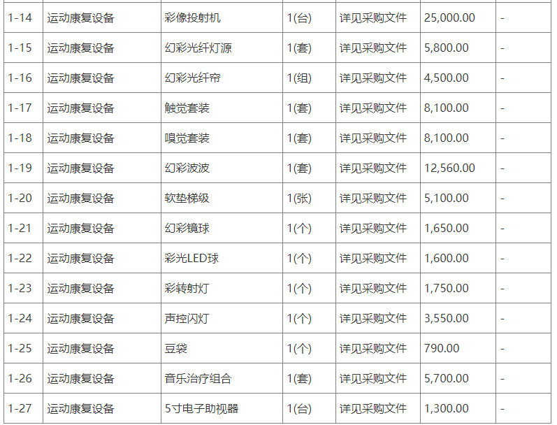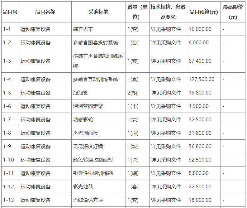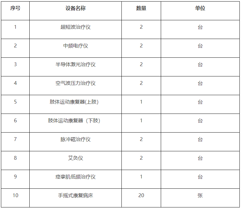 采購需求:運(yùn)動(dòng)康復(fù)、作業(yè)治療、言語吞咽治療、物理因子治療、傳統(tǒng)康復(fù)、疼痛科、產(chǎn)后康復(fù)等設(shè)備的采購安裝調(diào)試及相關(guān)伴隨服務(wù)。