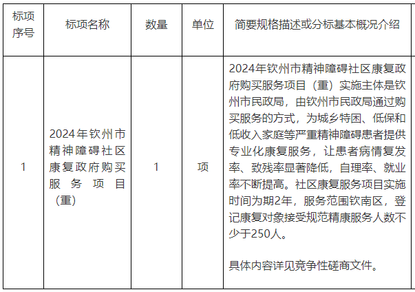 廣西榮勝項(xiàng)目管理有限公司關(guān)于2024年欽州市精神障礙社區(qū)康復(fù)政府購買服務(wù)項(xiàng)目(重)(QZZC2024-C3-990301-RSZB)競爭性磋商公告