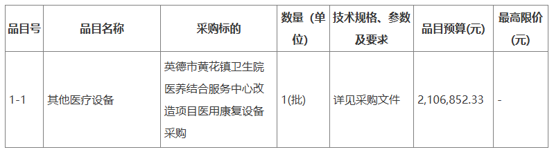 英德市黃花鎮(zhèn)衛(wèi)生院醫(yī)養(yǎng)結(jié)合服務(wù)中心改造項(xiàng)目醫(yī)用康復(fù)設(shè)備采購招標(biāo)公告