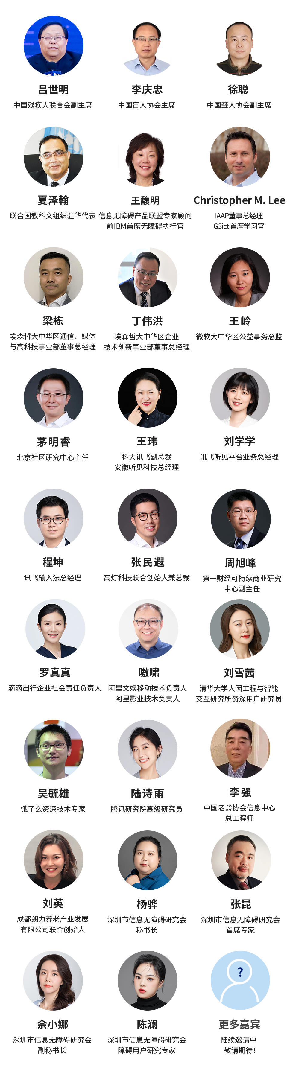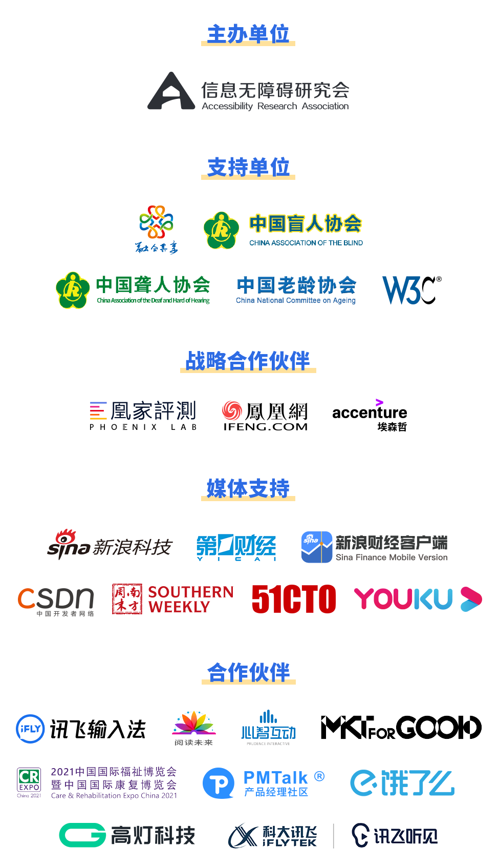 (主辦單位:信息無障礙研究會(huì);支持單位:全國(guó)無障礙環(huán)境建設(shè)智庫(kù);中國(guó)盲人協(xié)會(huì);中國(guó)聾人協(xié)會(huì);中國(guó)老齡協(xié)會(huì);萬(wàn)維網(wǎng)聯(lián)盟(W3C中國(guó));戰(zhàn)略合作伙伴:凰家評(píng)測(cè);鳳凰網(wǎng)科技;埃森哲;媒體支持單位:新浪科技;第一財(cái)經(jīng);新浪財(cái)經(jīng);CSDN;南方周末;51CTO;優(yōu)酷;合作伙伴:訊飛輸入法;心智互動(dòng);杭圖事業(yè)基金會(huì)閱讀未來專項(xiàng)基金;MARKETING FOR GOOD;2021中國(guó)國(guó)際福祉博覽會(huì)暨中國(guó)國(guó)際康復(fù)博覽會(huì);PMTalk產(chǎn)品經(jīng)理社區(qū);餓了么;高燈科技;科大訊飛丨訊飛聽見)