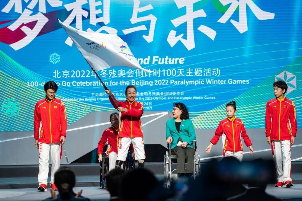 11月24日,北京2022年冬殘奧會倒計時100天主題活動在北京舉行,中國殘聯(lián)主席張海迪(右三)為冬奧會和冬殘奧會賽會志愿者中的殘疾人代表授旗。新華社記者 陳鐘昊 攝