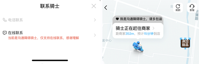在獲得騎手授權(quán)后,餓了么App將向消費(fèi)者提示當(dāng)前配送騎手為聽(tīng)障者。當(dāng)消費(fèi)者聯(lián)系騎手時(shí),“電話”選項(xiàng)會(huì)默認(rèn)關(guān)閉,系統(tǒng)將建議用戶消費(fèi)者與騎手在線文字溝通。“該服務(wù)的核心是尊重騎手的意愿和隱私,只要騎手不主動(dòng)設(shè)置,消費(fèi)者看到的訂單頁(yè)面仍和普通騎手完全一致。”餓了么聽(tīng)障騎手體驗(yàn)負(fù)責(zé)人胡鹿強(qiáng)調(diào)。
