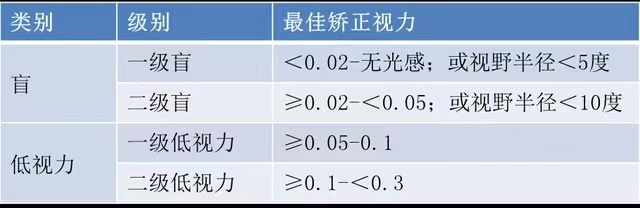 我國將視力殘疾分為盲和低視力兩類,雙眼中好眼最佳矯正視力低于0.3而等于或優(yōu)于0.05者為低視力;雙眼中好眼最佳矯正視力低于0.05者稱為盲,具體分類標(biāo)準(zhǔn)對(duì)照表如下:
