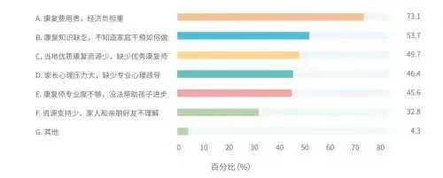 總體來看,康復費用貴、康復資源少,服務質量不夠高是家長們普遍面臨的問題?!端{皮書》顯示,73.1%的家長認為“康復費用貴,經濟負擔重”是主要困難。其次是“康復知識缺乏,不知道家庭干預如何開展”,占比 53.7%,以及“當?shù)貎?yōu)質康復資源少,缺少優(yōu)秀康復師”占比 49.7%。