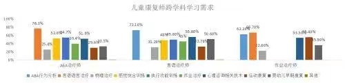 可喜的是,兒童康復行業(yè)已經展現(xiàn)出多學科精準康復的趨勢。從兒童康復師學習需求的角度來看,也呈現(xiàn)出多學科融合發(fā)展的趨勢。其中,在所調查的兒童康復師中,76.3%的ABA治療師希望學習言語語言治療技術,占比近8成;72.1%的言語治療師希望學習ABA行為分析技術,占比超過7成;同時,分別有66.7%和62.3%的作業(yè)治療師希望學習言語語言治療和ABA行為分析技術,超過6成。在兒童康復學科越發(fā)細分,越發(fā)專業(yè)的同時,學科融合的趨勢也越加明顯。