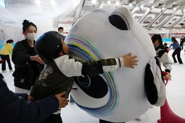 4月2日,北京,“星星的孩子”與冰墩墩人偶互動。當天是第16個世界孤獨癥日。國家游泳中心(水立方/冰立方)第十三次為“星星的孩子”點亮藍燈。中新社記者 韓海丹/攝
