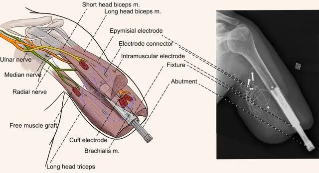 研究團隊在對一位手臂截肢患者進行了手術(shù)。他們將新的顯微外科技術(shù)與復(fù)雜的植入電極相結(jié)合,這些電極提供對假肢的單手指控制以及感覺反饋。其中,電極和骨整合接口分別提供與假體的電氣和機械連接。
