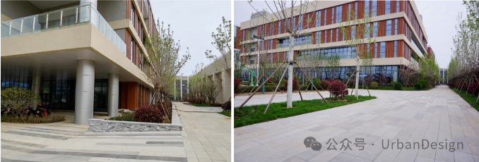 以中國人民大學(xué)通州新校區(qū)為例,該校區(qū)總用地 110 公頃,總建筑面積約 105 萬 m2,總體規(guī)劃呈一核兩軸多中心的框架體系, 3 條城市次干路穿行校園,成為重要的交通共享帶和城市界面,校園局部道路采用立體交通聯(lián)系,外圍城市干道設(shè)有地鐵站點(diǎn)。