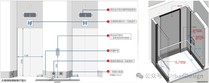 “創(chuàng)新核“建筑群內(nèi)部客梯共計(jì) 8 組 11 部 ,提高標(biāo)準(zhǔn)全部設(shè)置為無障礙電梯(圖 12),方便所有人使用,避免區(qū)別對(duì)待。電梯口采用八字口,轉(zhuǎn)角進(jìn)行圓角設(shè)計(jì),避免磕碰危險(xiǎn)。候梯廳設(shè)置低位呼梯按鈕、提示盲道、運(yùn)行顯示裝置等,并增設(shè)腳踏按鈕。轎廂內(nèi)設(shè)置低位操作盤、盲文按鍵、三面扶手、鏡面材質(zhì)、報(bào)層音響、聲光顯示裝置等。